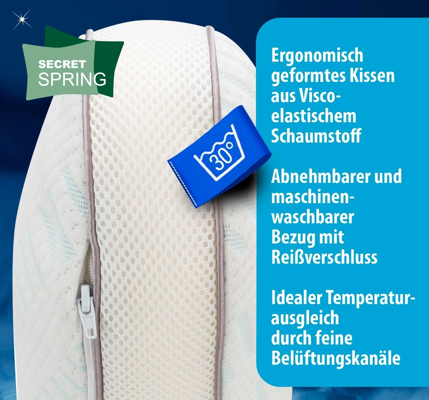 Durch die spezielle Form eignet sich das Kissen für Rücken‑, Seiten‑ und Bauchschläfer und unterstützt eine natürliche Schlafhaltung. Der Bezug ist abnehmbar und waschbar, wodurch das Kissen hygienisch und pflegeleicht bleibt.